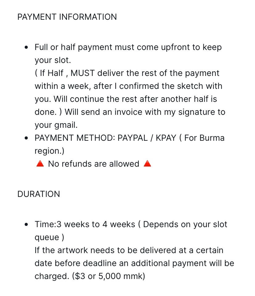 Full Body - 65 USD - 58,000 mmk( Extra charges for Complex background and extra items can be discussed. )